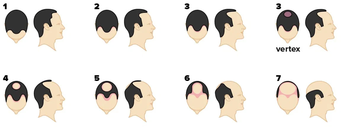 This variant of the Norwood scale is somewhat distinct and unusual. Most importantly, the hairline recedes consistently without leaving an island of hair in the middle, as well as no bald spot at the vertex. Instead, the hairline runs straight from the front to the rear.